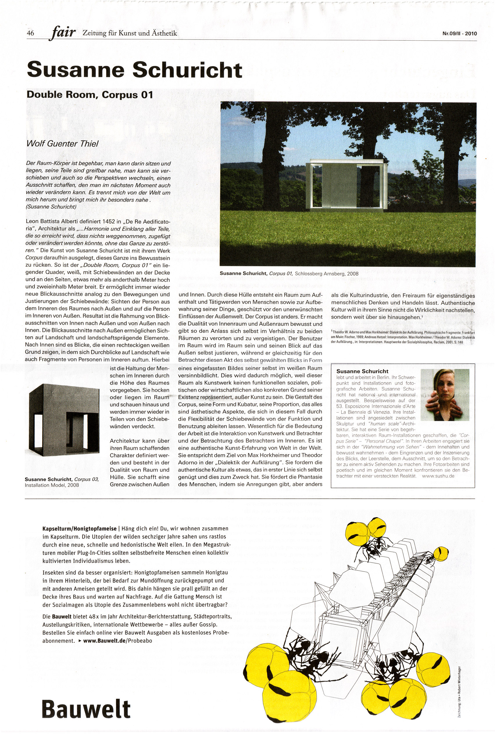 Related article in the magazine fair, Zeitung für Kunst und Ästhetik Wien / Berlin, 09 / II - 2010 about the first installation, Corpus 01